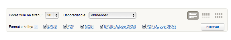 V naší nabídce jsou již stovky e-knih v různých formátech. Najdete zde knihy chráněné Adobe DRM, které si na rozdíl od jiných čteček na Kindle nepřečtete, ale i ty, které jsou chráněny sociálním DRM. Proto jsme pro vás připravili filtr, kterým snadno a rychle vyfiltrujete e-knihy ve formátech, které preferujete.Ať už je to je EPUB (Adobe DRM), MOBI nebo PDF, stačí si zaškrtnout formáty, které se vám mají zobrazovat a hledání té pravé e-knihy pro vás se výrazně usnadní. Filtr najdete v záhlaví každého seznamu e-knih, který si necháte zobrazit.