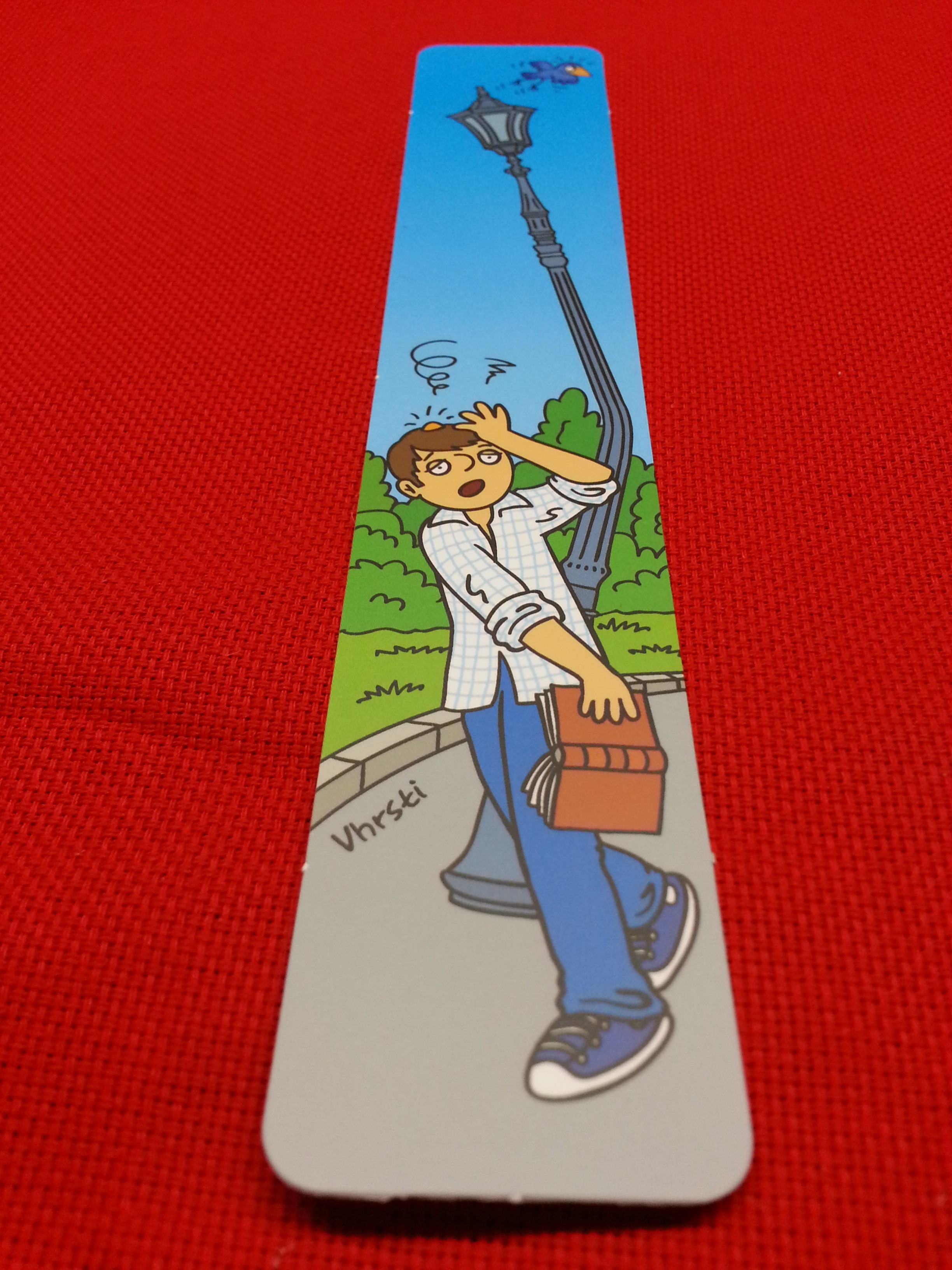 Vhrsti vykreslil na lednové záložce jeden ze zásadních problémů milovníků knih: narážení do lamp, semaforů, odpadkových košů a celých budov. Jakmile se začtete, nekoukáte nalevo ani napravo. A občas si, bohužel, dočtete několik posledních kapitol s boulí na hlavě.